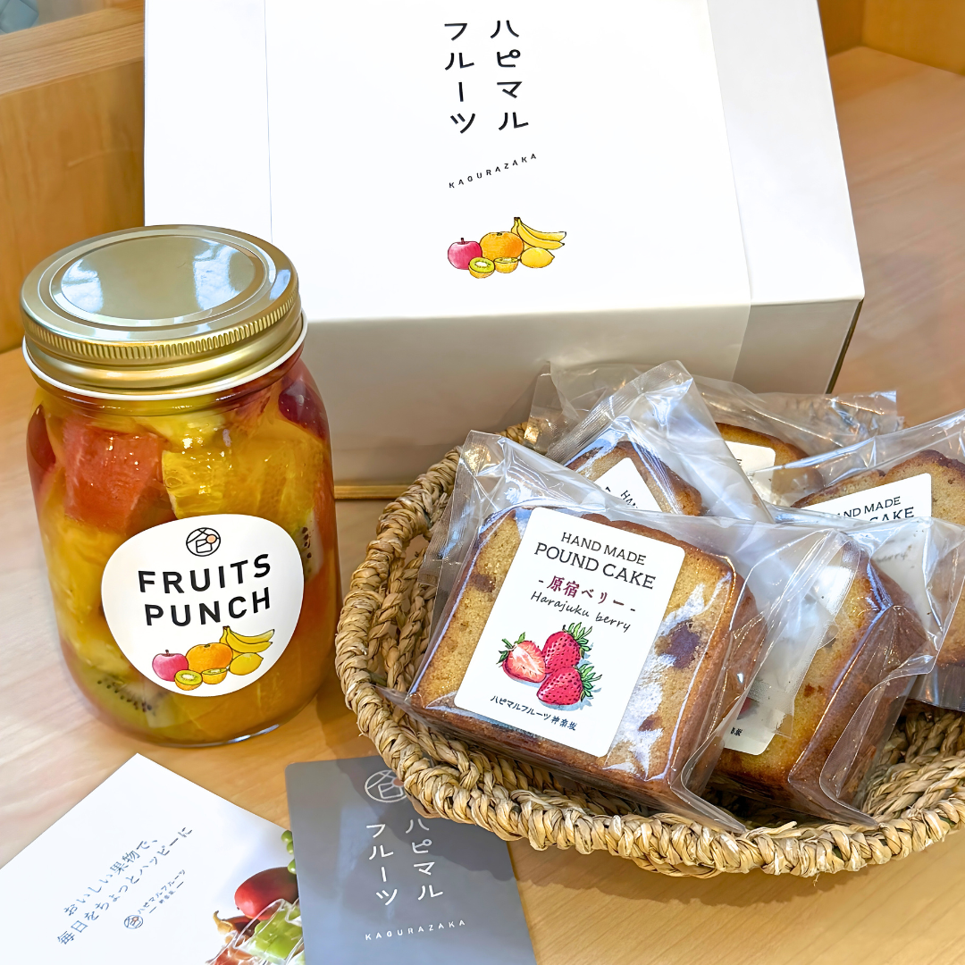 旬の果物とスイーツのお店「ハピマルフルーツ神楽坂」1番人気のフルーツポンチと、店内でひとつひとつ丁寧に焼き上げた焼き菓子のセットができました。